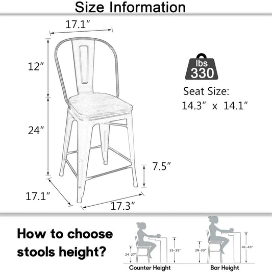 Metal Bar Stools Set of 4,24 inch Barstools Counter Height Bar Stool with Back Farmhouse Bar Stools with Larger seat High Back