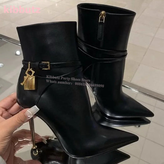 Metal Padlock Key Ankle Boots Genuine Leather Solid Color Pointed Toe Thin Heel Suede Side Zipper Fashion Runway Show Elegant