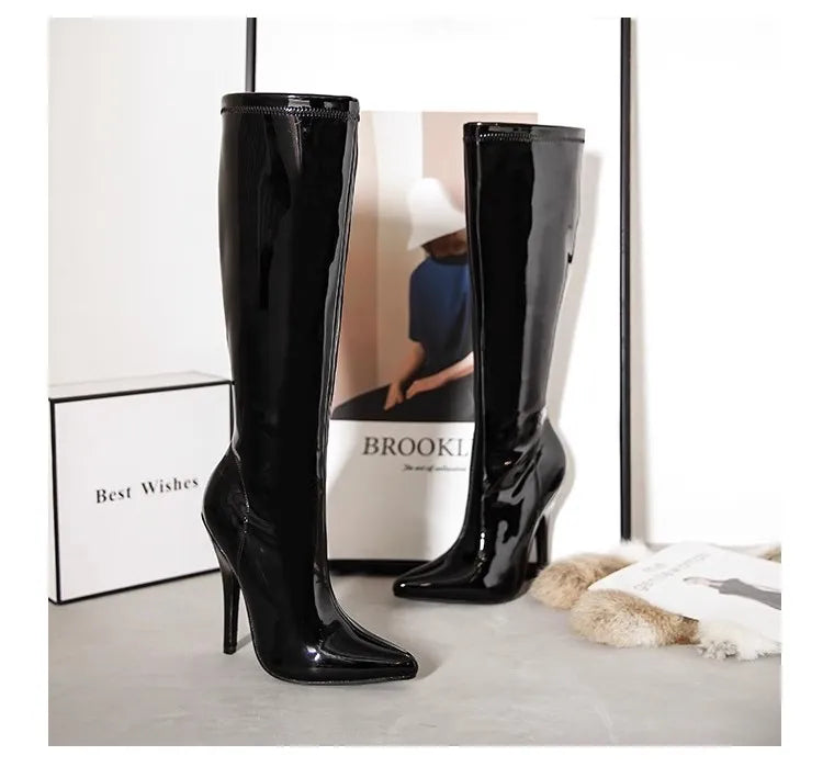 12cm Metal Heels Women Knee High Boots Black Matte Shiny Patent Leather Pointed Toe Zipper Tall Boots Size 45 Party Dress Shoes